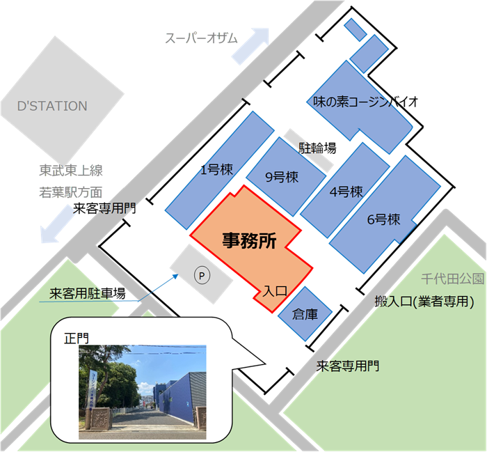 来客専用入り口は道路沿いではなく、千代田公園側にございます。